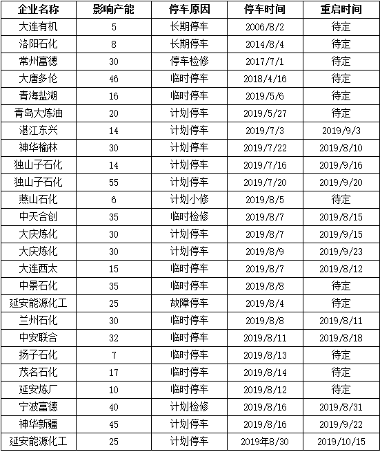 ????????2019年8月份新裝置投產(chǎn)情況匯總