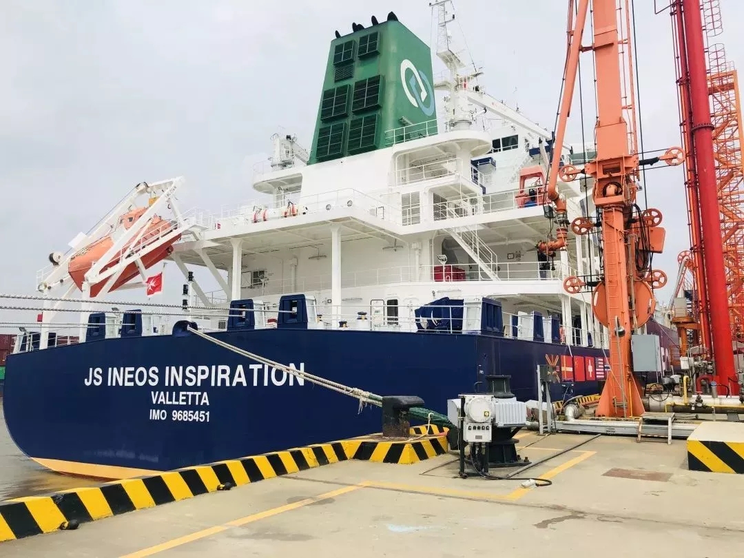 ????????8月7日13時(shí),乙烷運(yùn)輸船“英力士靈感號(hào)”靠泊泰興新浦2號(hào)碼頭。船上搭載的 1.5萬噸進(jìn)口乙烷在經(jīng)過南京海關(guān)所屬泰州海關(guān)的現(xiàn)場(chǎng)查驗(yàn)后,順利開卸,這也是國(guó)內(nèi)企業(yè)首次進(jìn)口乙烷產(chǎn)品。