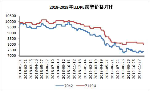 ????????從圖中顯示,2018-2019年國(guó)內(nèi)滾塑料價(jià)格明顯高于普通線性,且價(jià)格差距逐步擴(kuò)大,2019年較普通線性高50-850元/噸。目前國(guó)內(nèi)聚烯烴行業(yè)產(chǎn)能過(guò)剩,國(guó)內(nèi)石化一直致力于高端產(chǎn)品研發(fā),搶占高端領(lǐng)域,以獲取較大利潤(rùn)。從線性區(qū)域來(lái)看,由于產(chǎn)能過(guò)剩,7042價(jià)格近兩年一直處于下行通道,削減了石化利潤(rùn)。線性行業(yè),近年來(lái),研發(fā)主要方向集中在C8線性,茂金屬、滾塑料等,其中滾塑料做為一個(gè)分支,近年研發(fā)較多。