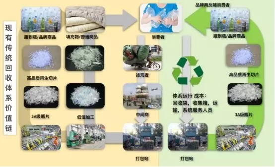 ????????在舊的PET價(jià)值鏈中,PET回收、分選和打包站,都是靠拾荒人群,沒(méi)有環(huán)保成本和對(duì)工人的保護(hù),物流效率低下,瓶片賣到化纖企業(yè),再生產(chǎn)品沒(méi)有很高附加值。而現(xiàn)在這種模式已經(jīng)難以為繼,品牌企業(yè)的加入,對(duì)于高品質(zhì)可追溯PET瓶的要求,城市垃圾分類,環(huán)保執(zhí)法,致使拾荒人群逐步消失,取而代之的是高品質(zhì)回收體系,回收+互聯(lián)模式的構(gòu)建,同時(shí)這也增加了回收系統(tǒng)的成本。用再靠賣給化纖工廠這些方式已經(jīng)不能的低端低值應(yīng)用,無(wú)法維持PET的價(jià)值鏈。