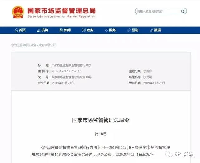 ????????11月26日,國家市場監(jiān)督管理總局發(fā)布《產品質量監(jiān)督抽查管理暫行辦法》,將自2020年1月1日起施行?!掇k法》共56條,明確了監(jiān)督抽查的組織、抽樣、檢驗、異議處理、結果處理及相關人員應承擔的法律責任,對于加強產品質量監(jiān)督管理、規(guī)范產品質量監(jiān)督抽查工作、保護消費者的合法權益有重要意義。