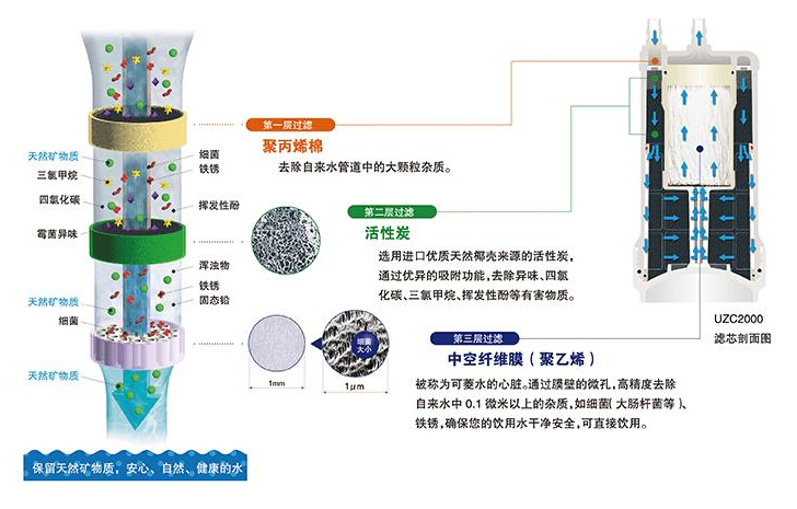 ????????通過(guò)聚丙烯棉、活性炭及中空纖維膜組成的三層過(guò)濾系統(tǒng),過(guò)濾后保留天然礦物質(zhì),為用家?guī)?lái)安心、自然、健康的飲用水。