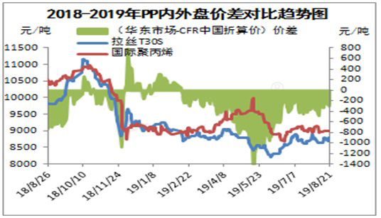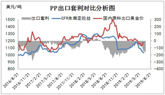 ????????面對(duì)國內(nèi)PP產(chǎn)能激增時(shí)代,無論是貿(mào)易還是生產(chǎn)企業(yè)都在謀求出路,于是出口成為多數(shù)業(yè)者最佳選擇。由PP出口套利對(duì)比分析中發(fā)現(xiàn),以CFR東南亞拉絲為例,國內(nèi)PP拉絲產(chǎn)品出口到東南亞價(jià)格仍高于當(dāng)?shù)貎r(jià)100-150元/噸,而且照目前兩者價(jià)差發(fā)展趨勢(shì)發(fā)現(xiàn),國內(nèi)市場(chǎng)在8月底至9月初正是下游需求逐步恢復(fù)之際,國內(nèi)價(jià)格有抬高可能,短期仍不適合開啟出口窗口。
