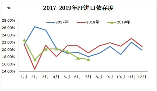 ????????由2017-2019年P(guān)P進(jìn)口依存度發(fā)現(xiàn),2019年4月份進(jìn)口依存度開始逐步下挫,7月進(jìn)口依存度同比下降1.82%,環(huán)比下降0.42%。由此數(shù)據(jù)可發(fā)現(xiàn)進(jìn)口PP產(chǎn)品在國內(nèi)依存度呈現(xiàn)逐步下降趨勢(shì)。其實(shí)這與國內(nèi)PP產(chǎn)能激增密不可分,進(jìn)口PP產(chǎn)品由于整體價(jià)高,在國內(nèi)市場(chǎng)競(jìng)爭(zhēng)優(yōu)勢(shì)逐步減弱,除部分高端專用產(chǎn)品在下游仍占據(jù)優(yōu)勢(shì)外,按照目前國內(nèi)PP擴(kuò)能計(jì)劃逐步實(shí)現(xiàn),進(jìn)口PP在國內(nèi)依存度有進(jìn)一步下降趨勢(shì)。