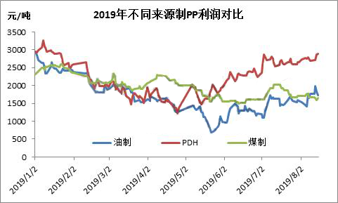 ????????此次東華能源計劃投產(chǎn)的裝置,繼續(xù)采用PDH工藝,為何近幾年來PDH裝置如雨后春筍般,蜂擁而至?首先從終端產(chǎn)品利潤來看。以聚丙烯為例,2019年丙烷脫氫制聚丙烯平均利潤在2000元/噸以上,下半年以來,因為丙烷價格震蕩下行,跌幅遠(yuǎn)大于聚丙烯價格跌幅,生產(chǎn)企業(yè)利潤好轉(zhuǎn)。丙烷脫氫制聚丙烯利潤明顯好于煤制和油制利潤。